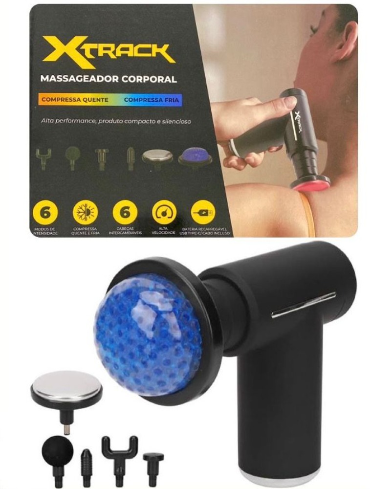 Massageador corpora XTRACK, com alta performance , produto compacto e silencioso . Com 6 modos de intensidade , compressa quente e fria , 6 cabeças intercambiáveis , alta velocidade e bateria recarregável com cabo incluso .